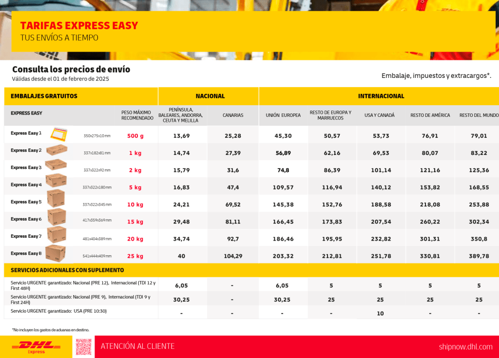 DHL ofrece cajas de diversos tamaños de forma gratuita para el envío de su paquete. Es importante tener en cuenta que cada tamaño y destino conlleva un costo diferente. Se le recomienda utilizar las cajas proporcionadas por DHL Express. A continuación, se le indicarán los pasos para realizar su envío en punto DHL Express: