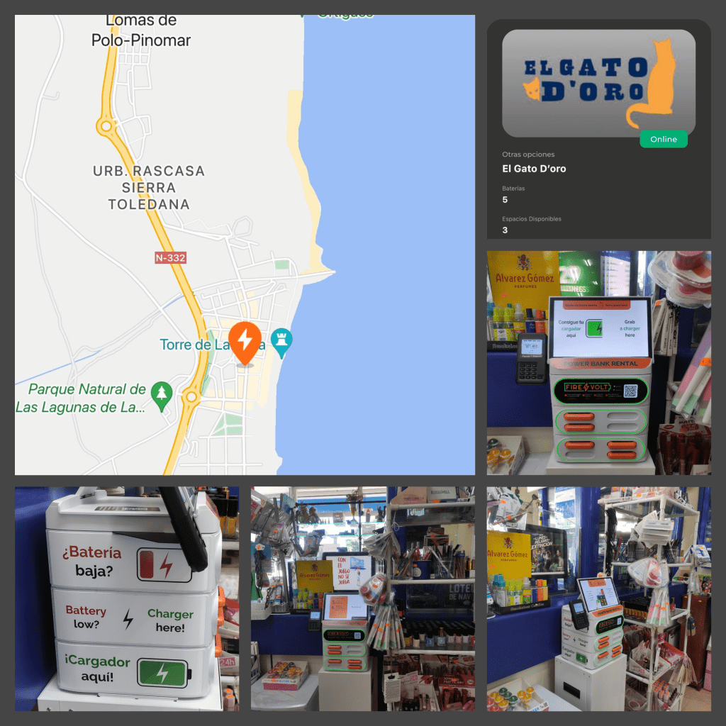 FireVolt ofrece la posibilidad de alquilar una batería externa para recargar su dispositivo móvil en situaciones de necesidad, proporcionando movilidad y permitiendo pagar únicamente por el tiempo de uso. Considere la situación en la que durante un viaje, la batería de su dispositivo se encuentra baja, no dispone de un cargador y por un costo inferior al de un café, FireVolt le ofrece 30 minutos de carga para realizar llamadas importantes, enviar correos electrónicos o capturar fotografías. No dude en acudir a la estación de recarga FireVolt del Gato D’oro cuando lo requiera.