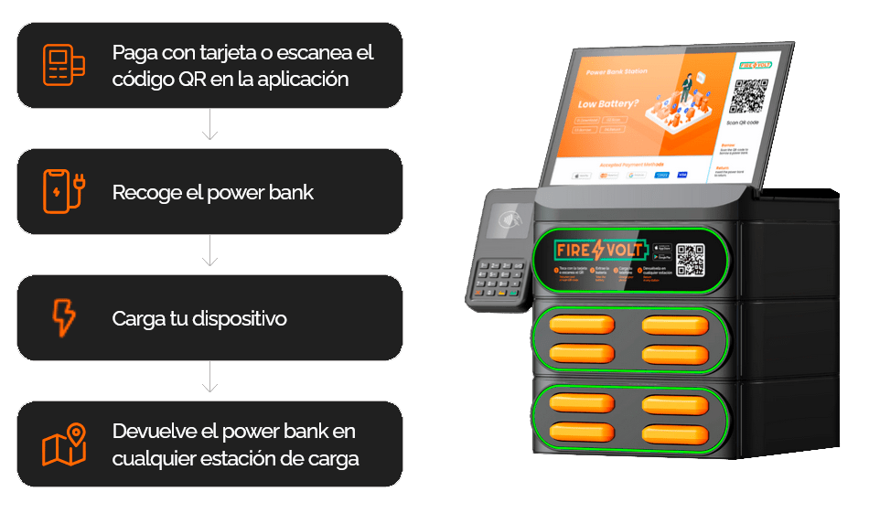 Si experimenta una disminución en la carga de su dispositivo móvil, FireVolt representa una solución idónea. Este innovador servicio proporciona un sistema integral de alquiler de baterías externas. Los usuarios pueden alquilar y devolver una batería externa en cualquier estación de recarga FireVolt.