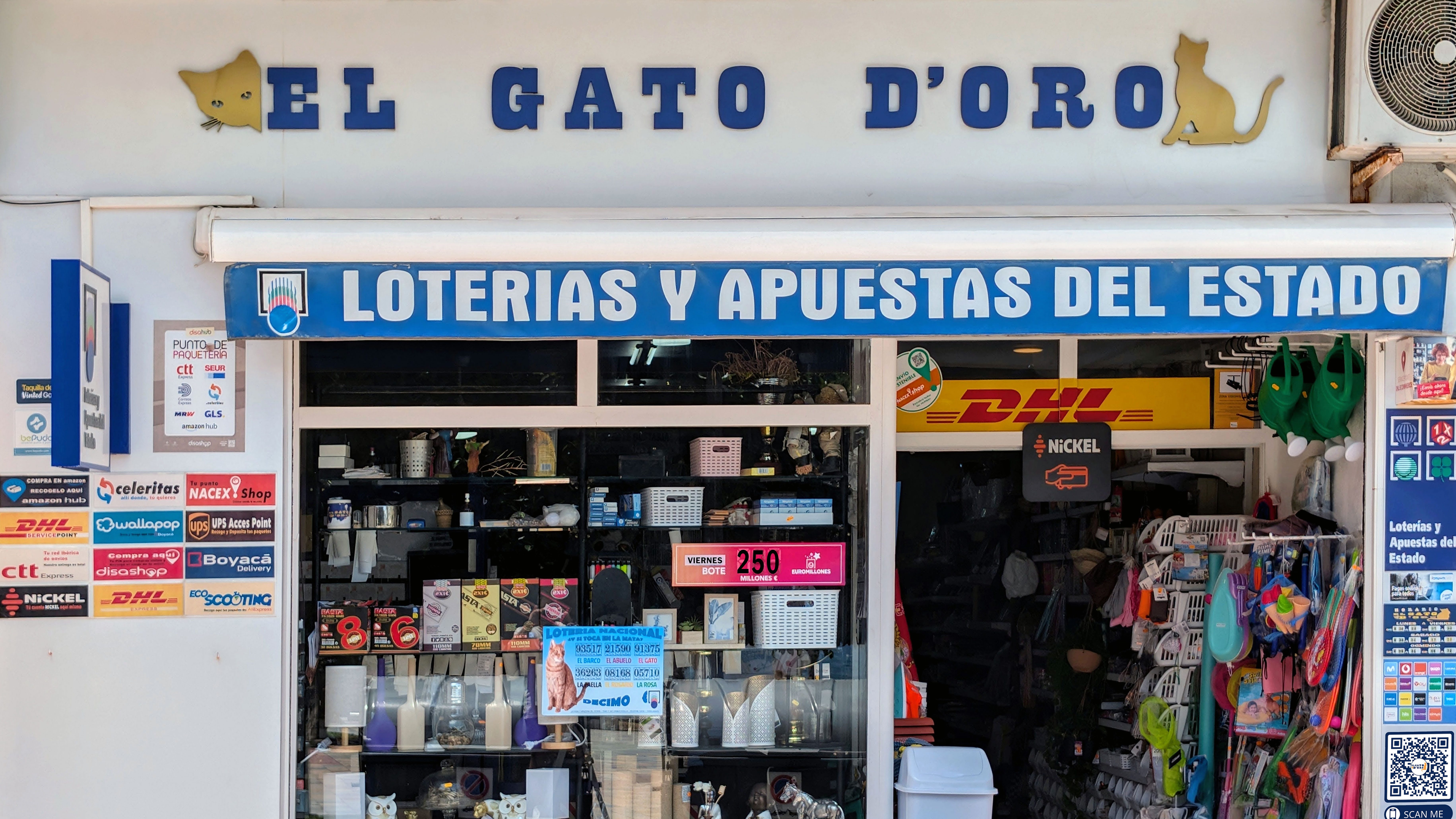 Además de ser un punto de recogida de paquetes, dentro de su amigo «El Gato D’oro» te ofrecemos diversos servicios adicionales, como el servicio de recargas de Dishashop, la sucursal del Banco Nickel, envió de dinero con RIA Money Transfer un Punto Mixto de Loterías y un Bazar multiprecios (todo a 100).